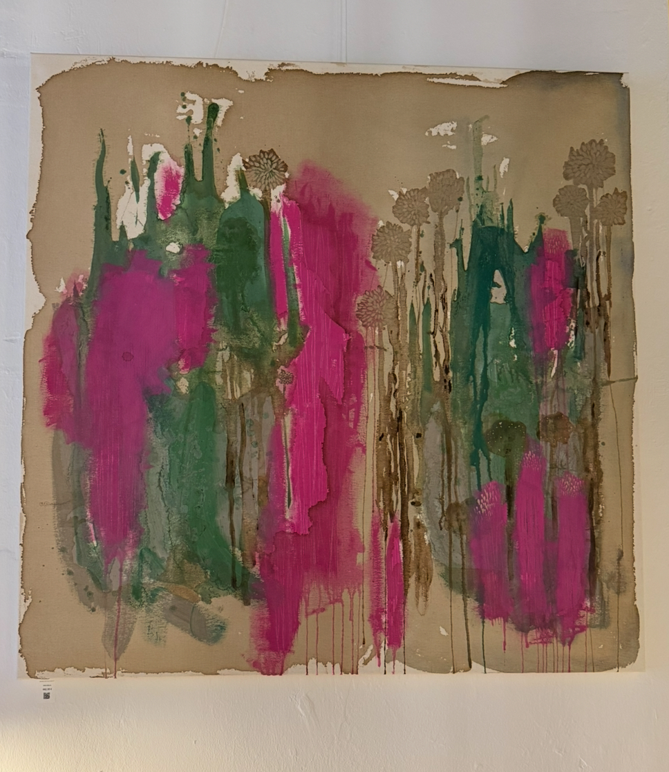 Eesti kunstniku Piret Elli pool valminud akrüülmaal ”Roosa päikese loojang”. Maali ümbritseb oliivroheliseks värvitud männipuidust raam.
