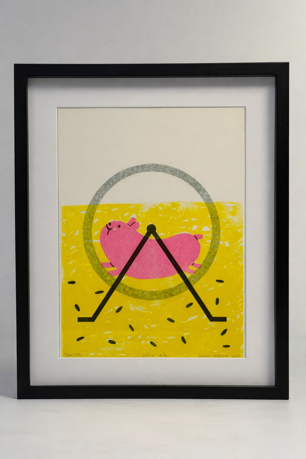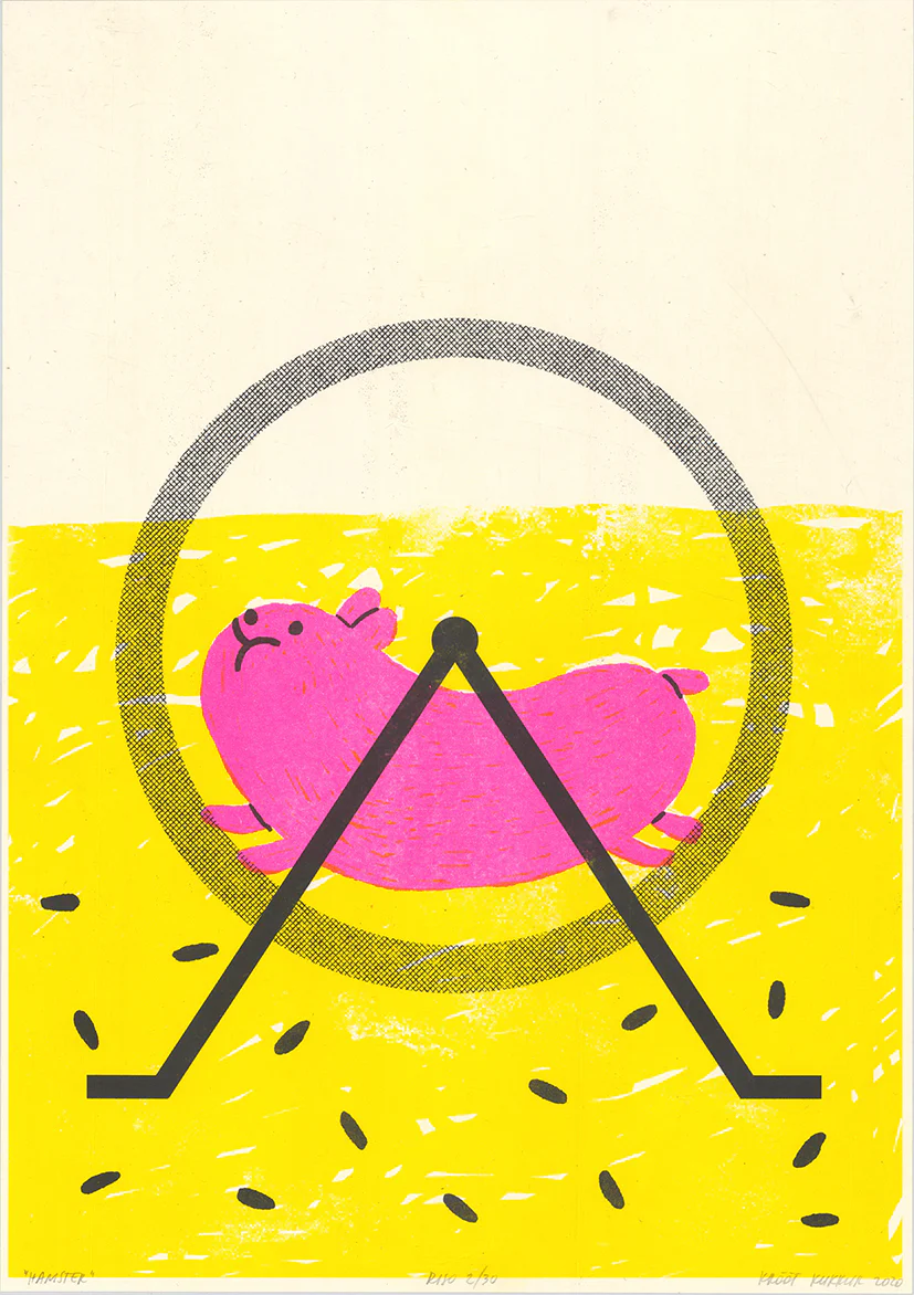 Eesti kunstniku Krõõt Kukkuri poolt valmistatud 3-värviline risotrükk (neoonroosa, kollane, must) loodusvalgele 170 g A3 paberile.