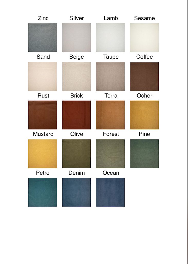 103SESAME, 104LAMB, 110SAND, 120BEIGE, 151SILVER, 270MUSTARD, 273OCHER, 320DENIM, 330OCEAN, 340PETROL, 350PINE, 352OLIVE, 353FOREST, 410TERRA, 432COFFEE, 440TAUPE, 450ZINC, 500BRICK, 501RUST